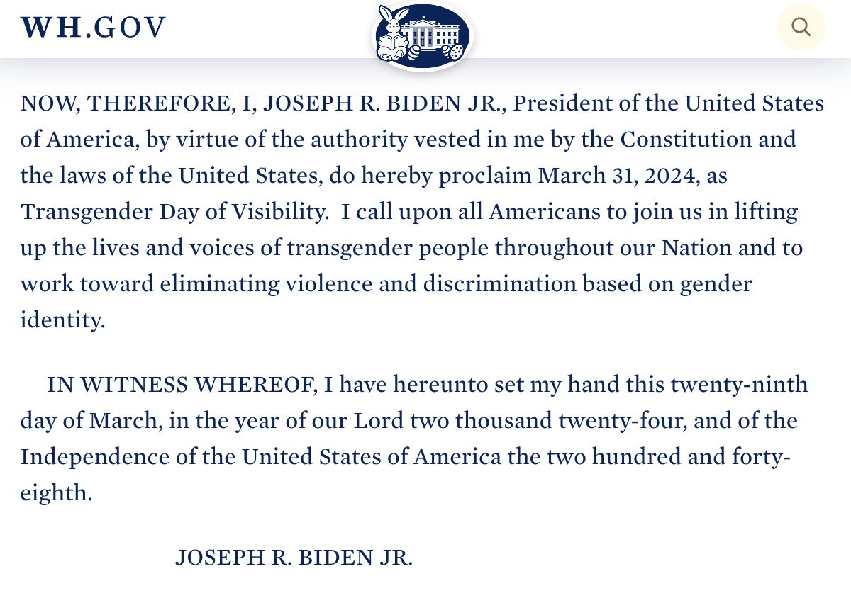 In his proclamation, Biden wrote, “Today, we send a message to all transgender Americans: You are loved. You are heard. You are understood. You belong. You are America, and my entire Administration and I have your back.”